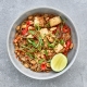 Sekoita kaikki ainekset tomaattia lukuun ottamatta hyvin, ja anna maustua. Seoksen voi tehdä halutessaan jo edeltävänä päivänä.