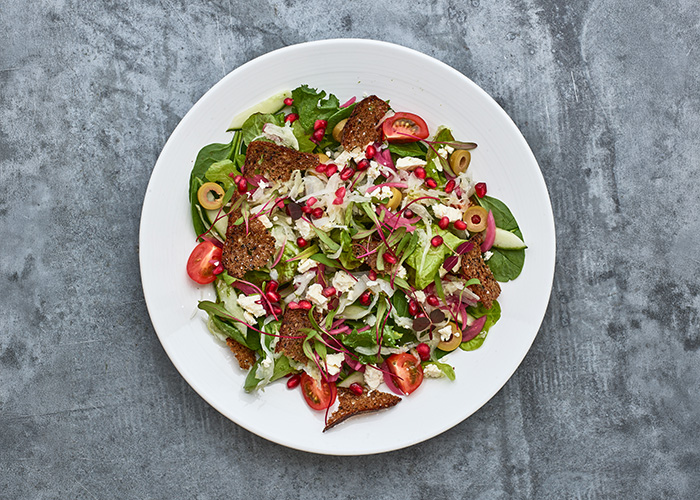 Sekoita salaatin kaikki muut ainekset paitsi mallasleipäsipsit. Sekoita kastike joukkoon.
