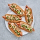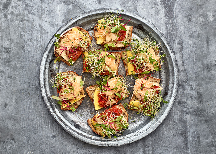 Paahda leivät uunissa tai paahtimessa. Levitä niiden päälle tuorejuusto. Kokoa leivät seuraavassa järjestyksessä:
